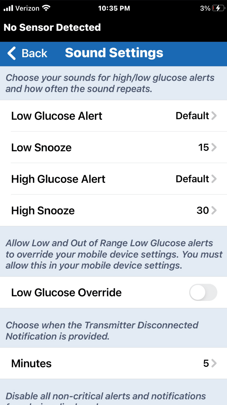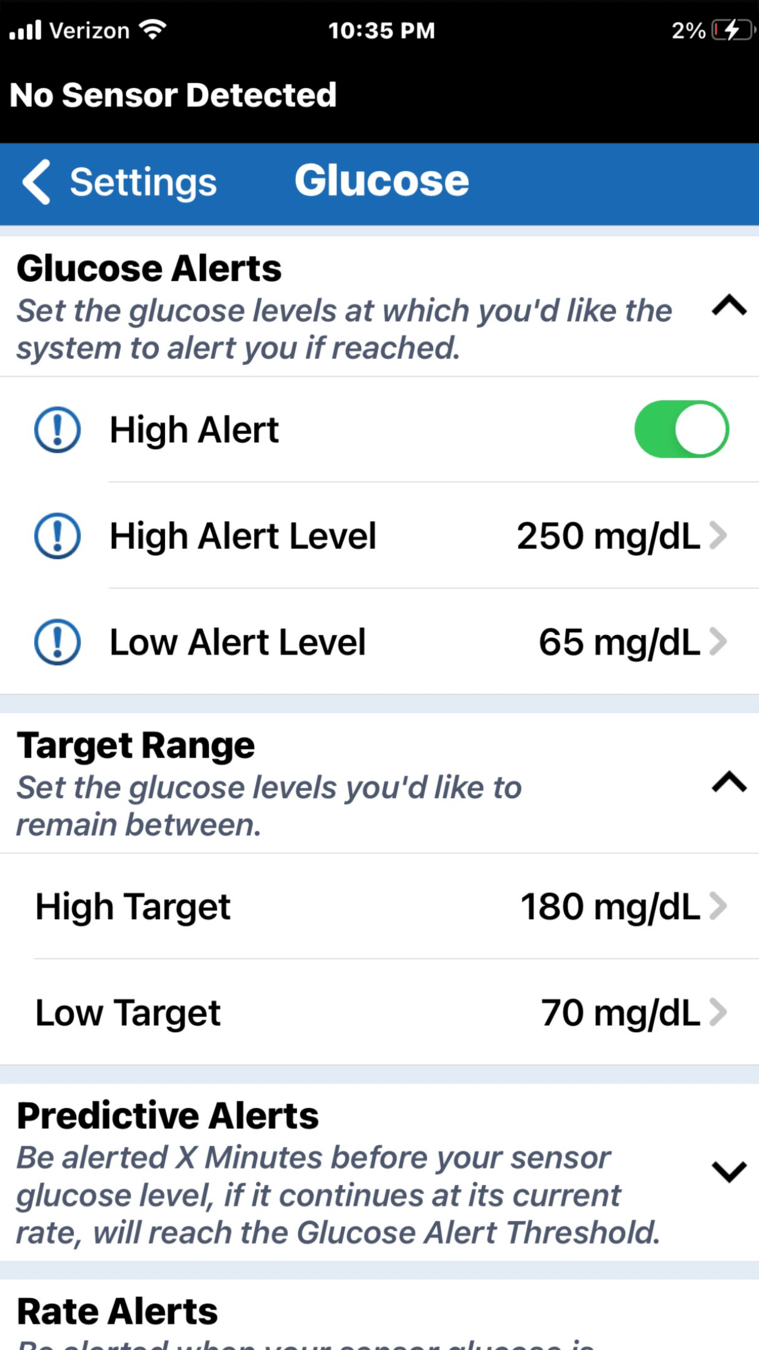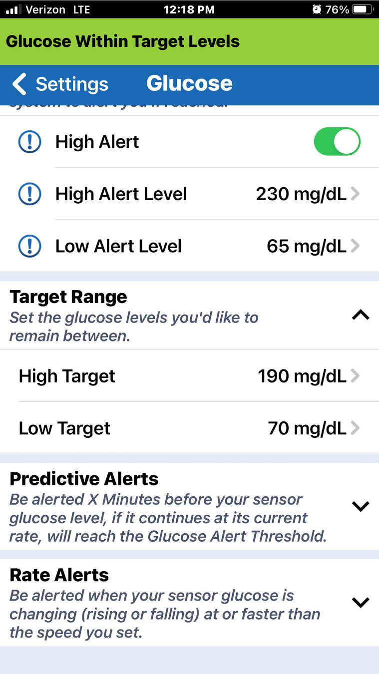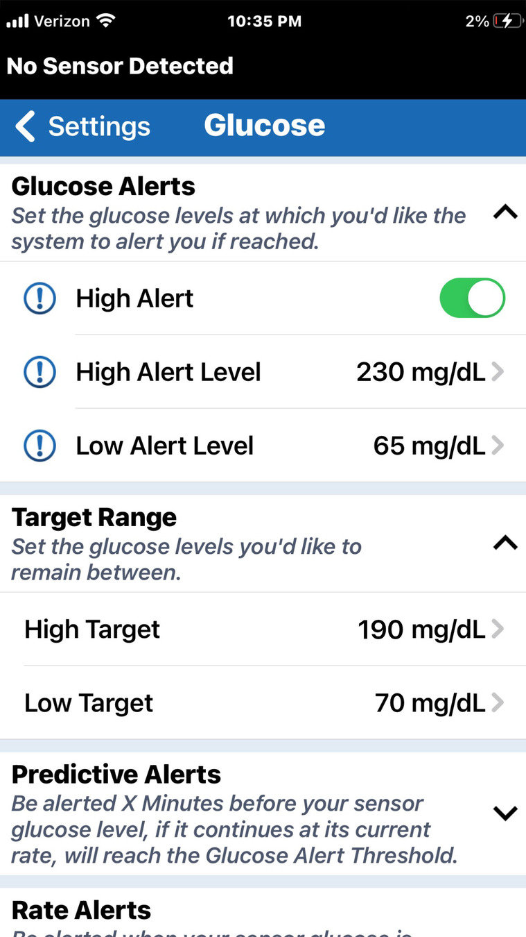 As you go into the glucose settings, you’ll see the Glucose Alerts section at the top.