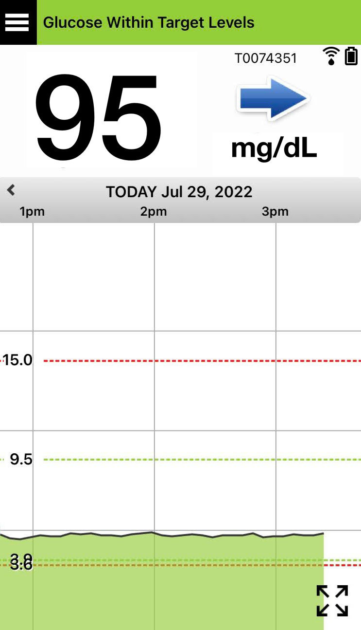 Here’s an example. Let’s say you are about to eat a meal and are considering your insulin dose. You look at your Eversense App and see that your glucose level is 95 mg/dL and the trend arrow is flat. This means your glucose level is currently stable, so it’s likely that no adjustment to your normal pre-meal insulin dose is needed.