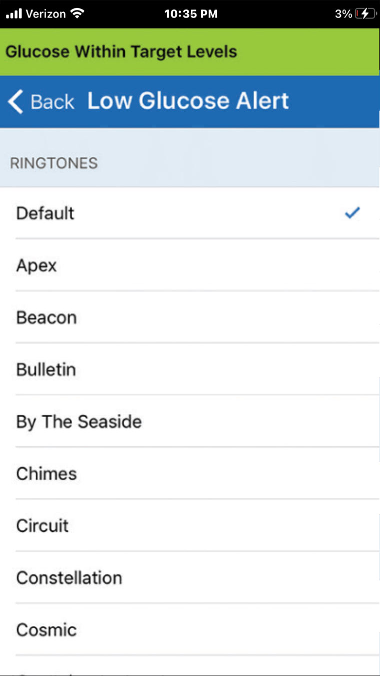 For example, to change your low glucose alert sound, tap on the ringtone name to hear the sound and make your choice.